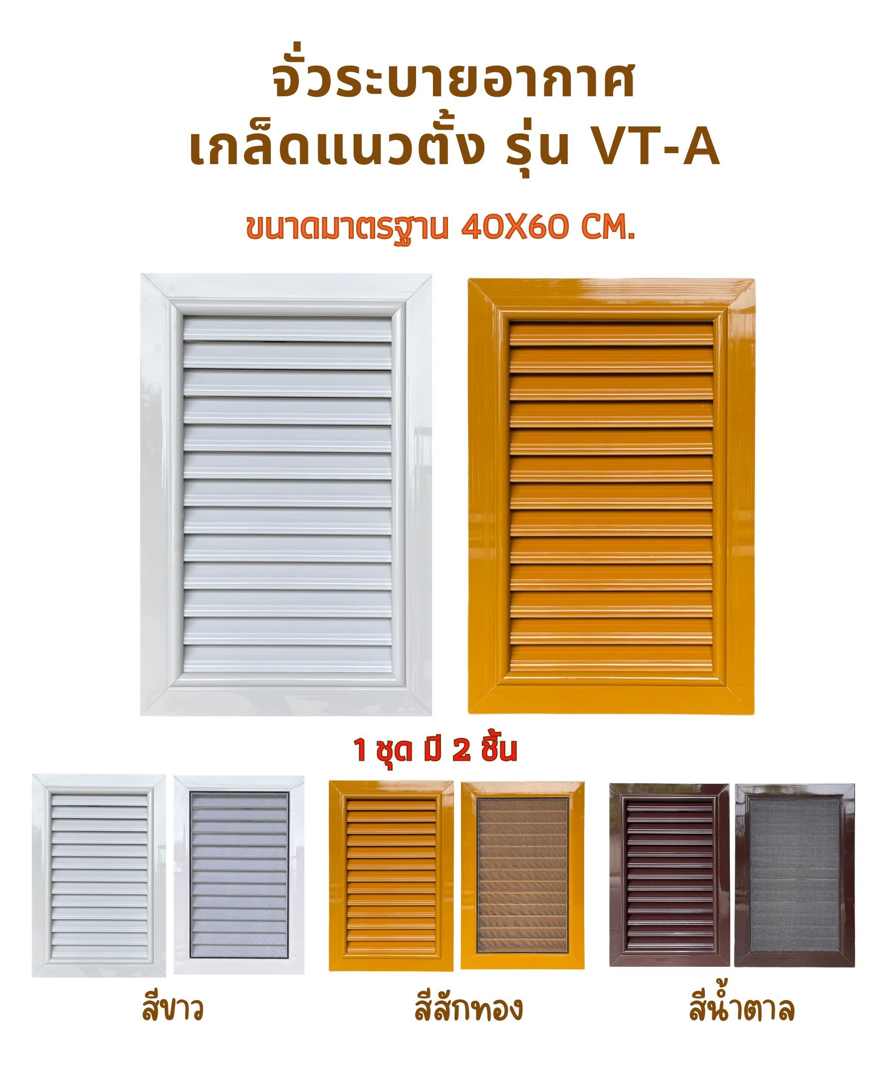 รายละเอียด – ขนาด 40x60x3.7cm. – มีให้เลือก 3 สี สีขาว, สีสัก, สีน้ำตาล – มีมุ้งลวดกันแมลง